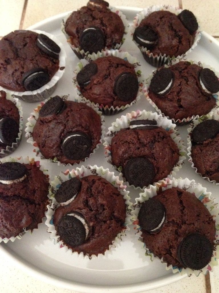 Remplir les moules tapissés de caissettes en papier, parsemer du chocolat mis de côté, décorer si vous voulez, avec des mini-oréo et enfourner 20 minutes.