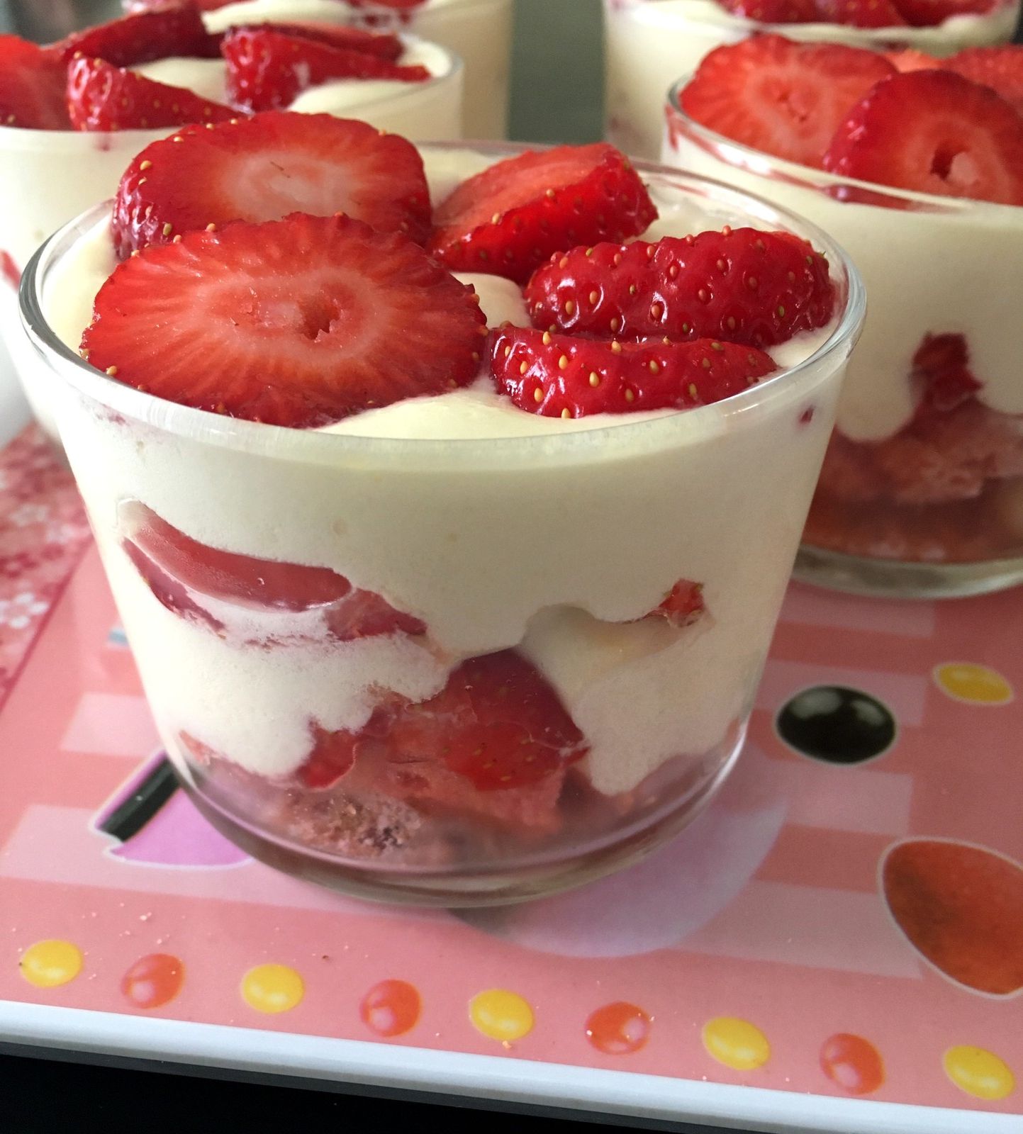 Dans des verrines, déposer 1 biscuit (si vous avez du sirop de fraise, tremper les biscuits dedans).